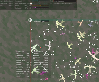 Traits that can evolve include the weights and bias of a creature's perceptron, and their physical traits which can become more powerful with some drawbacks.