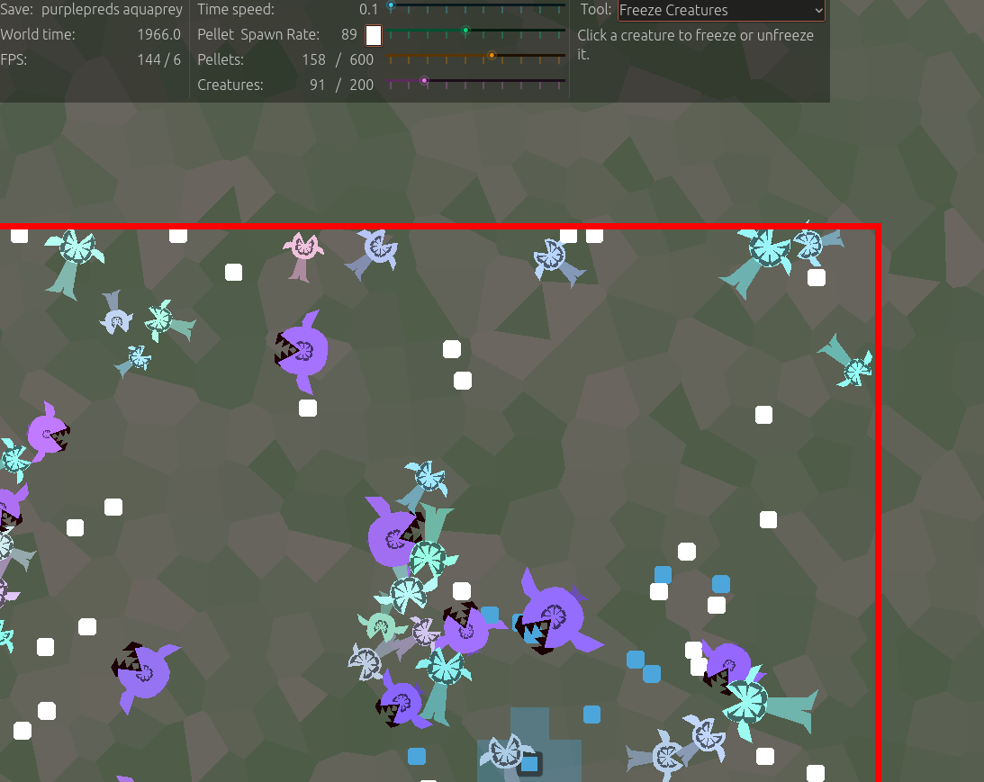 The ecosystem evolves based on how you shape the environment. Create an expansive and prosperous environment to foster multiple different survival strategies, or create a barren wasteland where creatures must race for scraps of food to survive.